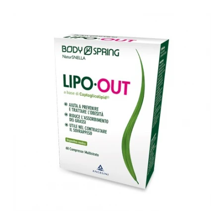 LIPO•OUT Dispositivo Medico CE 0426, classe IIa. A base di Captoglicolipid, un complesso polisaccaridico della glucosamina ad alta viscosità in grado di legare i lipidi, associato ad una sostanza in grado di potenziarne l’attività. LIPO•OUT, se associato ad una dieta ipocalorica e ad un’adeguata attività fisica, è un adiuvante per controllare il peso. LIPO•OUT è formulato in una compressa a doppio strato a rilascio differenziato. Ogni compressa rilascia circa il 50% del complesso polisaccaridico nello stomaco entro 15 minuti, mentre la completa disintegrazione della compressa avviene in ambiente intestinale entro 1 ora. LIPO•OUT lega i lipidi non appena viene a contatto con i grassi alimentari nello stomaco creando un grosso complesso costituito da lipidi e fibre. Si forma quindi un gel fluido e stabile che circonda completamente questo agglomerato stabilizzandolo e facendo si che non venga alterato dalle variazioni dei livelli di pH che si verificano tra lo stomaco e l’intestino tenue. Il complesso di lipidi e fibre contenente il grasso non digerito non viene quindi assorbito dall’intestino tenue e viene fisiologicamente eliminato dalle feci.