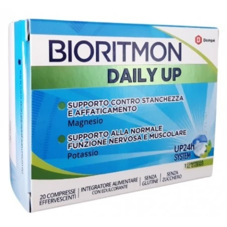Bioritmon Daily Up è un integratore alimentare a base di magnesio e potassio. La sua formula osmoticamente bilanciata e la singola somministrazione giornaliera (UP24h System) ne rende maneggevole l’utilizzo nelle situazioni di spossatezza fisica e stanchezza precoce, dovute a un aumentato fabbisogno o a una carenza di magnesio e potassio. Il magnesio contribuisce alla riduzione di stanchezza e affaticamento, al normale funzionamento del sistema nervoso, alla normale funzione muscolare e psicologica e al mantenimento di un normale metabolismo energetico e dell’equilibrio elettrolitico. Il potassio contribuisce alla normale funzione muscolare e nervosa.