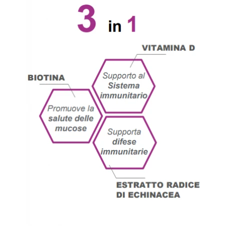Integratore alimentare con miele, biotina, vitamina D ed estratto di radice di echinacea.