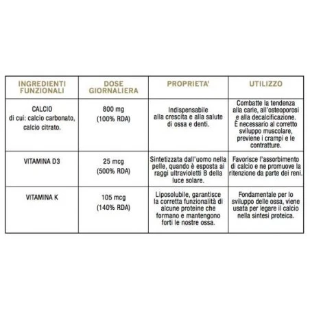 Integratore alimentare in compresse a base di calcio, con vitamina D3 e vitamina K1.